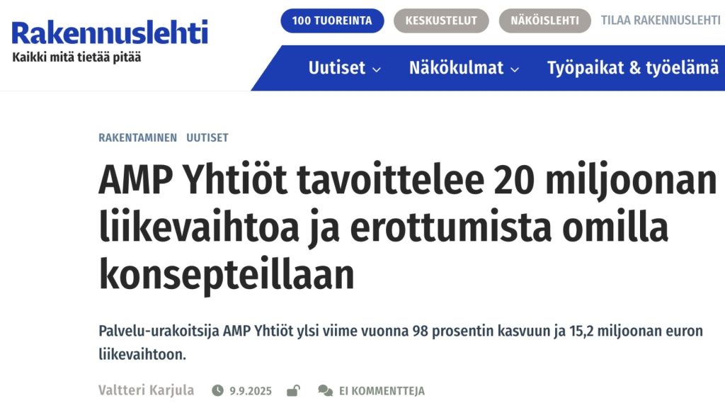 Ensimmäisenä nostona tämä Rakennuslehden juttu, jonka pääsin kirjoittamaan. Toimin jatkossa Rakennuslehden vapaana toimittajana ja tulen tekemään annettuja juttuja lehdelle. Tässä artikkelissa sain haastatella AMP Yhtiöiden toimitusjohtajaa ja kertoa heidän hienosta kasvutarinasta. Juttu on luettavissa täällä.