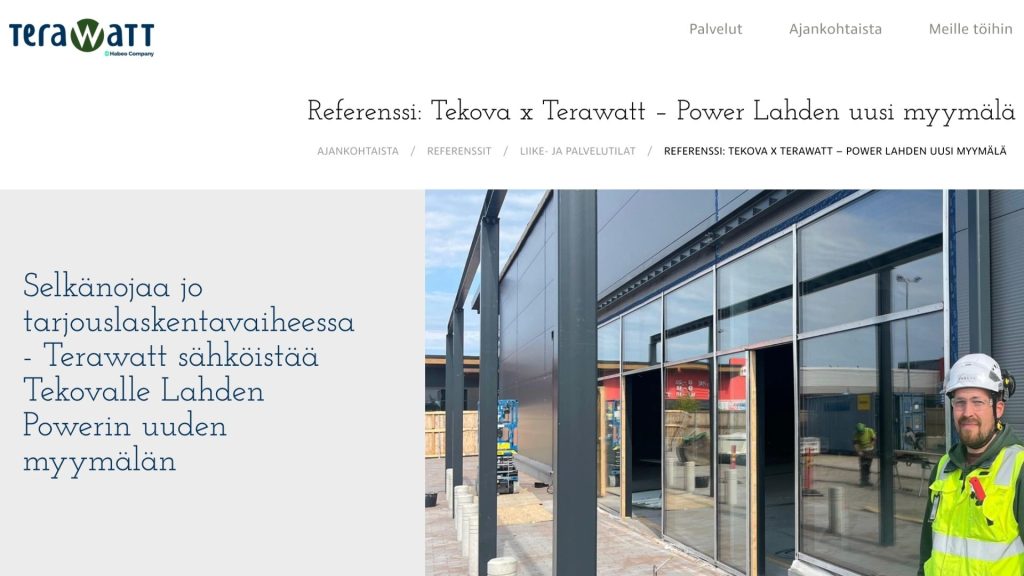 Toisessa sisältönostossa kirjoitin referenssitarinan asiakasyritykselle. Referenssitarinat ovat itselleni mieluisia kirjoituksia, sillä niissä pääsee tekemään puhtaalle paperille. Samalla myös oppii kaikesta liiketoiminnasta paljon, kun kyselee ja selvittää taustoja. Vierailin Terawatin asiakkaalla Tekovalla ja haastattelin heidän projektipäällikköä sähköurakan toteutuksesta. Referenssitarinan löydät tästä.